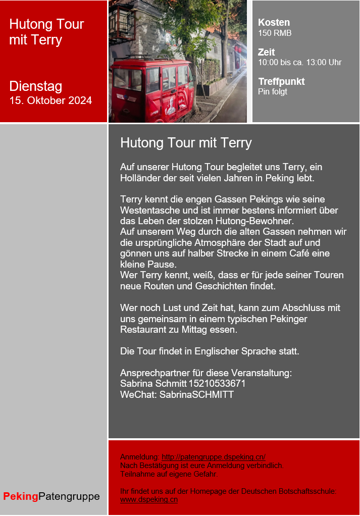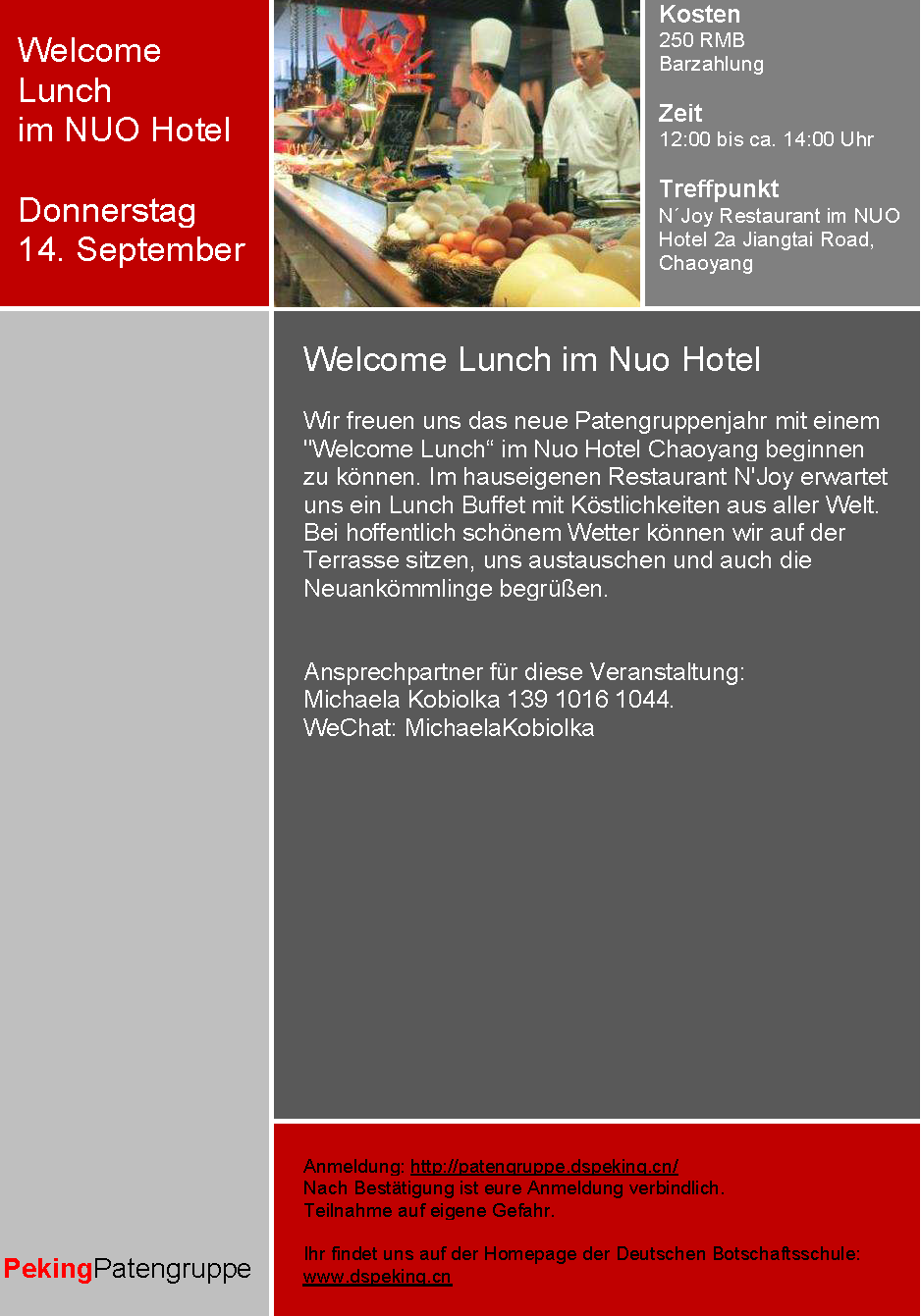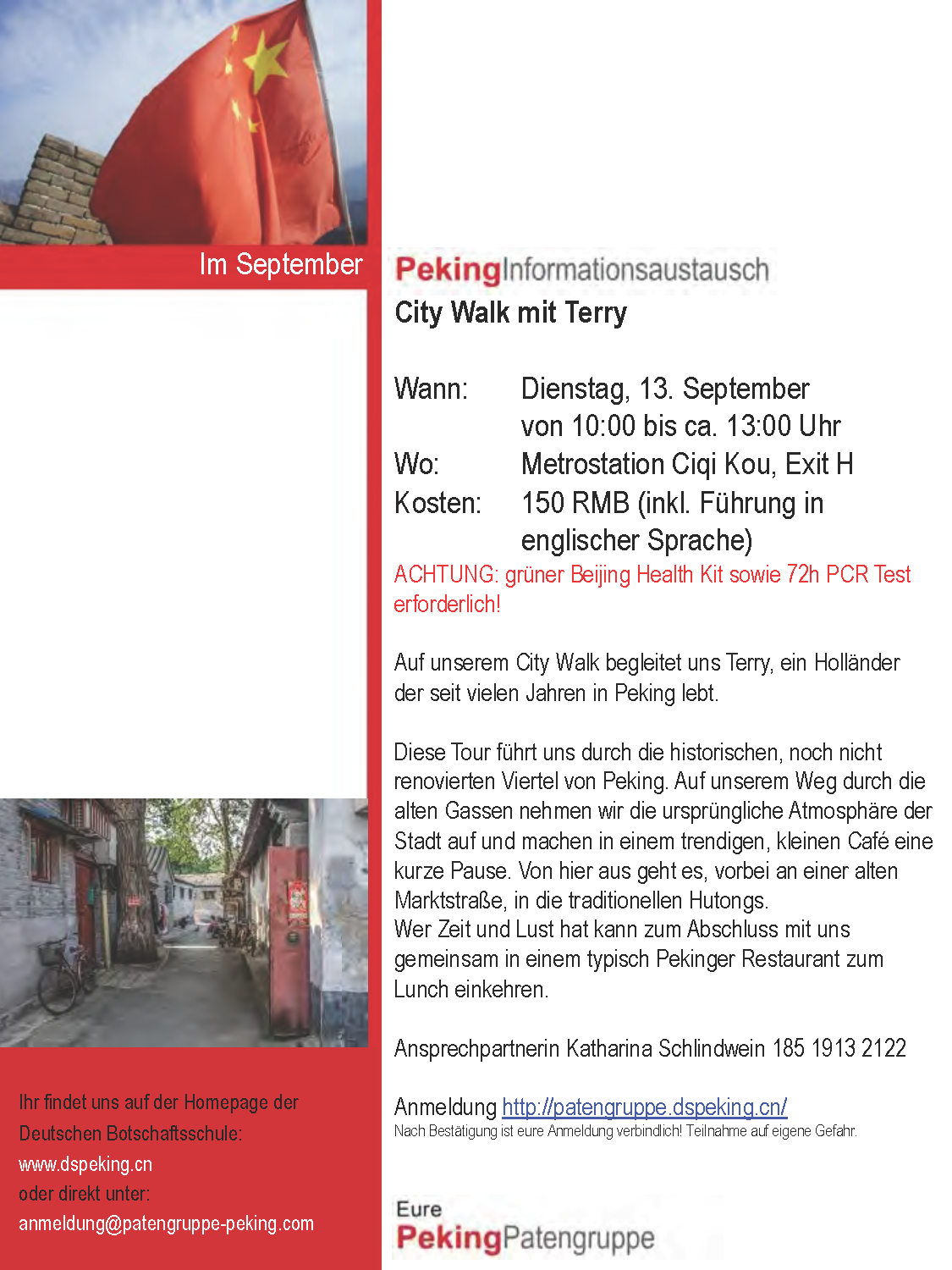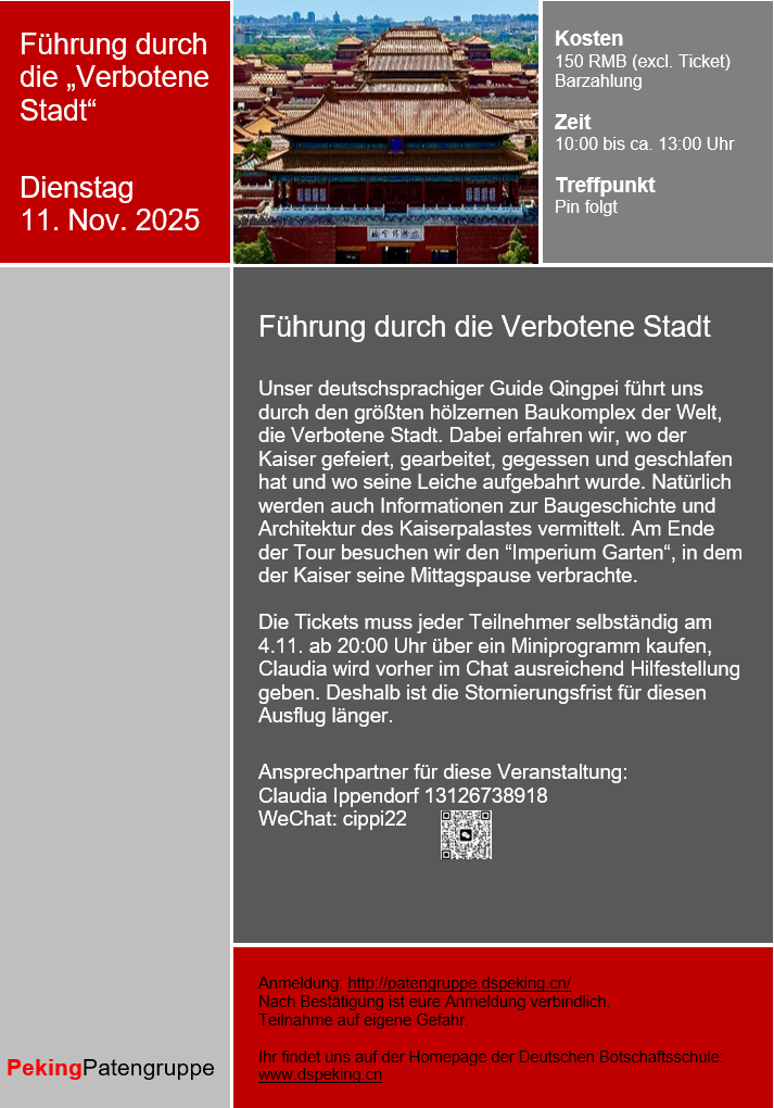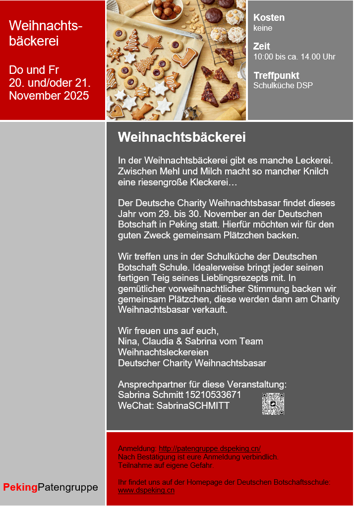 Alle Veranstaltungstermine findet ihr unter "Veranstaltungen der Patengruppe" und auf der Homepage der Deutschen Botschaftsschule Peking. Dort erhaltet ihr auch weitere Informationen und viele nützliche Tipps rund um das Leben in Peking.