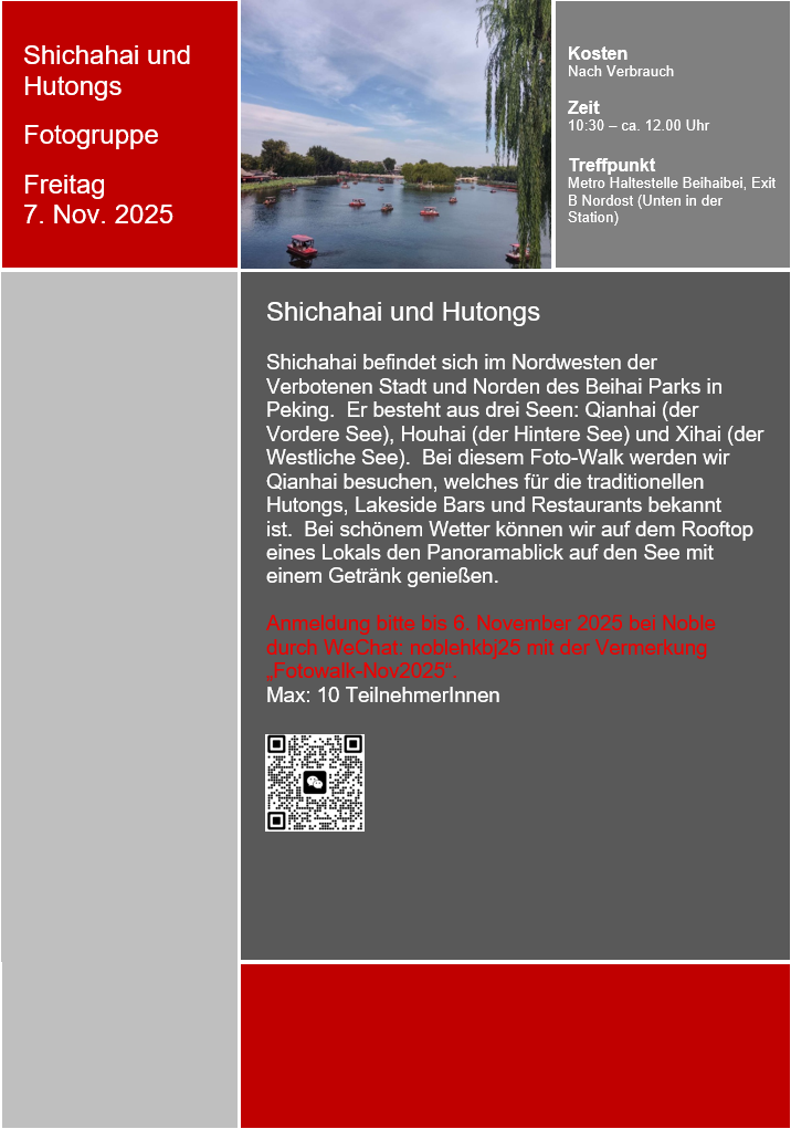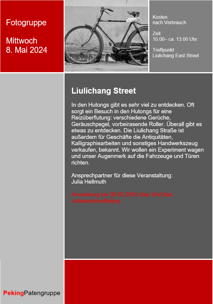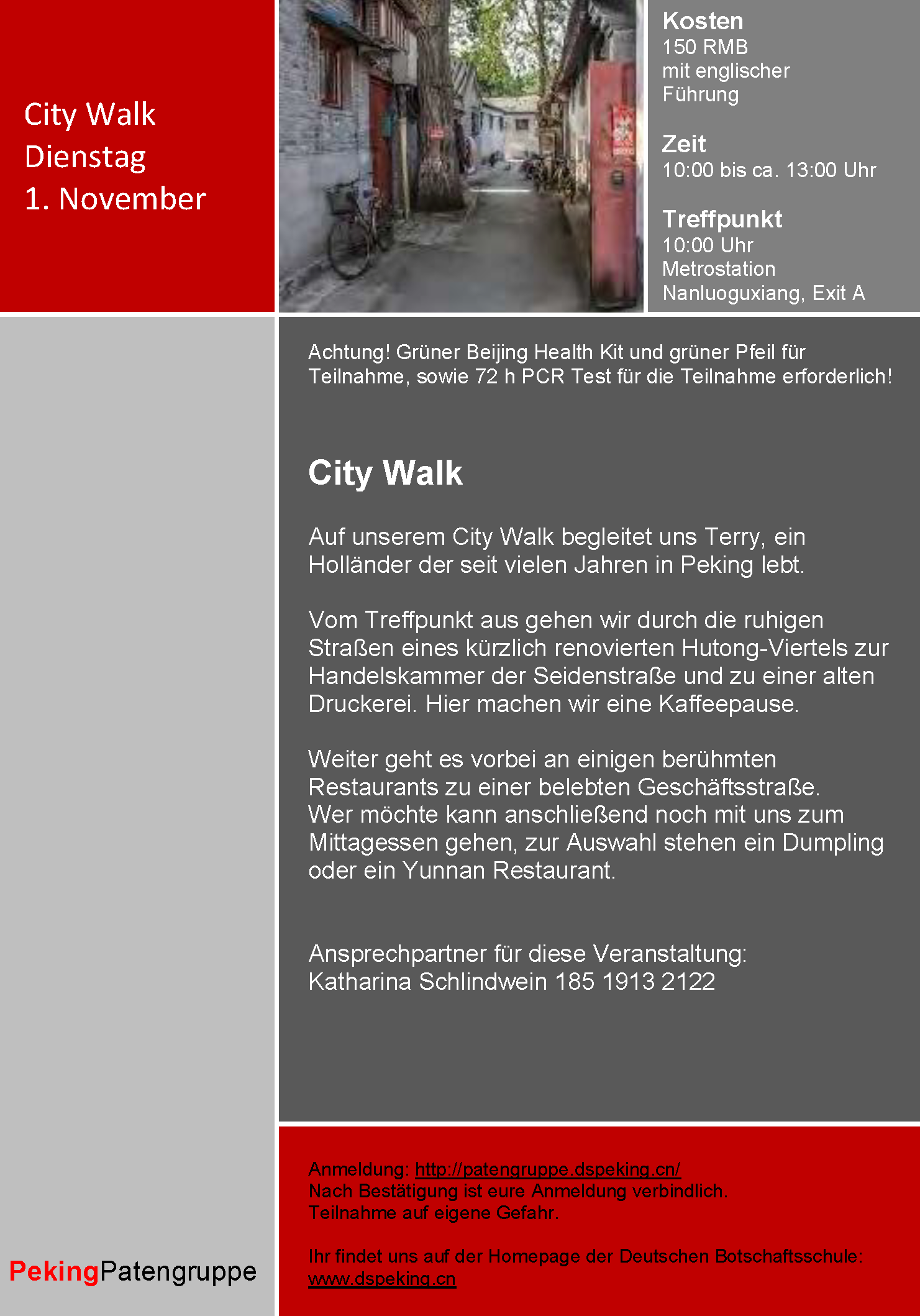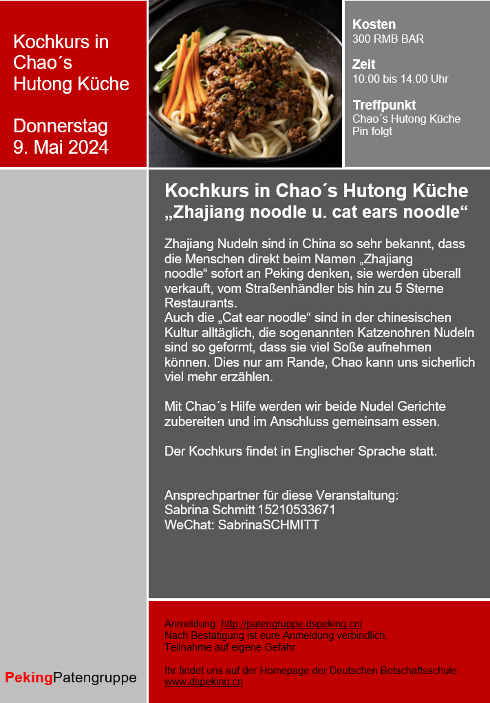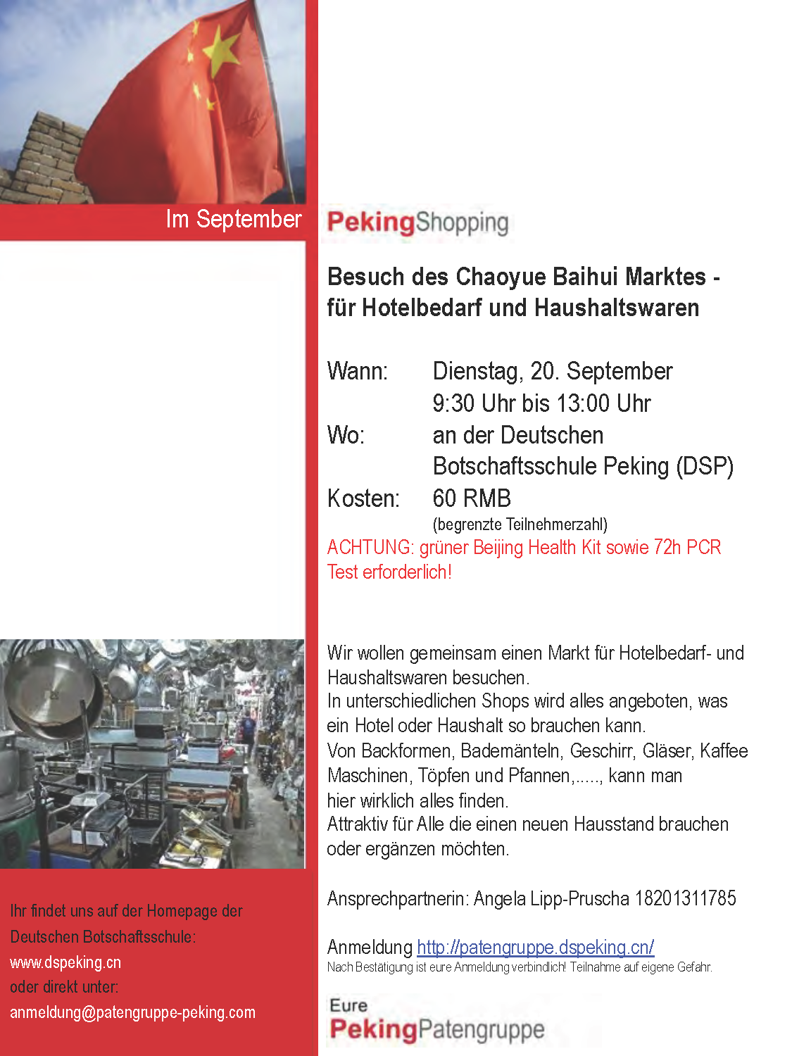 Alle Veranstaltungstermine findet ihr unter "Veranstaltungen der Patengruppe" und auf der Homepage der Deutschen Botschaftsschule Peking. Dort erhaltet ihr auch weitere Informationen und viele nützliche Tipps rund um das Leben in Peking.